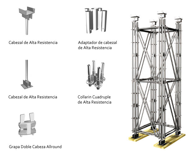Básicamente el sistema consiste en configurar un puntal basándose en cuatro verticales Allround, unidos entre si mediante el doble cabezal Allround, evitando el pandeo de verticales y rigidizando el conjunto.